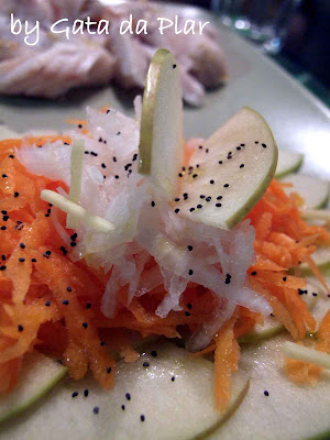 Con le julienne di carote e rape e le fettine di mela avanzate e un altro pochino di zenzero, fate un'unica insalatona da condire come quella decorata sul piatto, da servirvi in abbondanza dopo aver finito quella "di facciata" sul piatto! ^______^