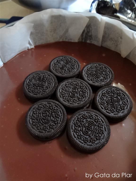 Riprendere dal frigorifero la tortiera, prendere un pò di biscotti Oreo e posarli al centro della ganache al cioccolato creando un disco.